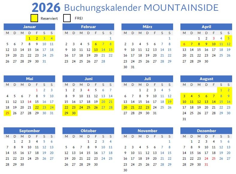 Bitte haben Sie Verständnis, dass wir aus zeitlichen Gründen keine Kurzanfragen (unter 3-Übernachtungen) und Anfragen für belegte Zeiträume entgegen nehmen können. Die belegten Zeiträume werden in "Gelb" angezeigt, die freien Zeiträume in "Weiß".